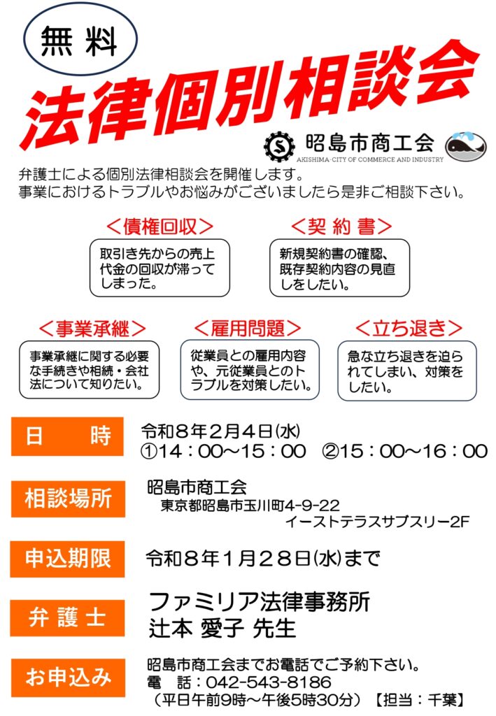 令和8年2月4日(水) ①14時00分~15時00分 ②15時00分~16時00分(会場は昭島市商工会:昭島市玉川町4-9-22 イーストテラスサブスリー2F)